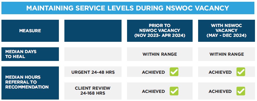Specifically, during the NSWOC vacancy there was an average of 211 NSWOC referrals per month. Interior Health Authority maintained its standard of care for urgent referrals of 24 to 28 hours and for clinical reviews of 24-168 hours while patient wound healing times